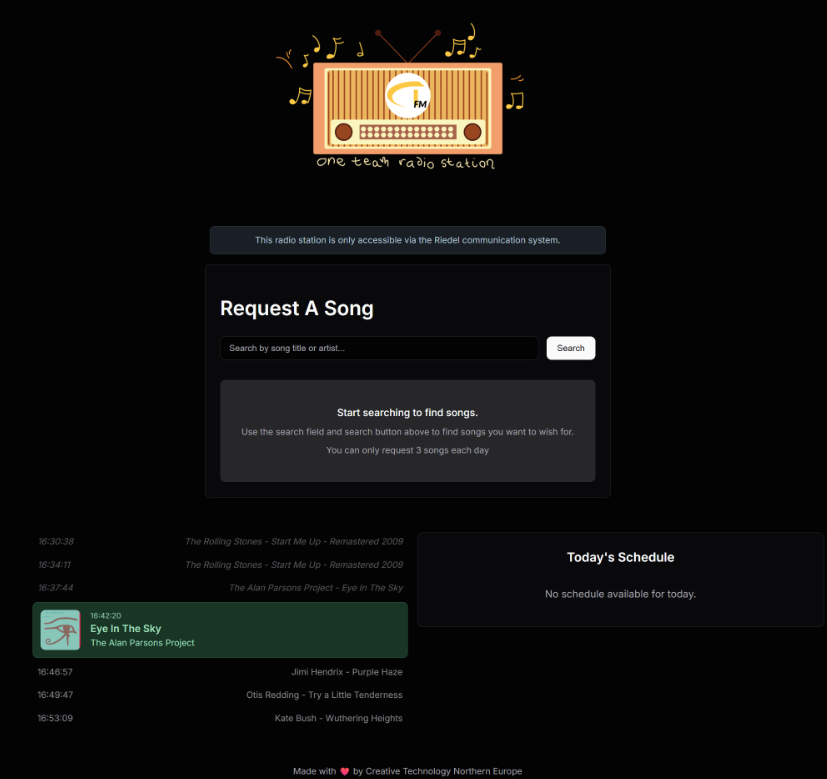 Maybe about two or three weeks into being onsite Gustav & Philip created CTFM which was a webpage linked to APIs where the whole production could put in three song requests a day and there was dedicated time slots each day for these requests to be played. For the rest of the time there was a fantastic radio station of songs curated by Nora. If you wanted to listen to CTFM you just had to ask coms help at Riedel and they would add it to the panel.